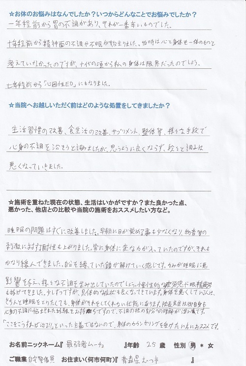 症例③:胃の不調・精神的な不調・不眠(25歳男性)